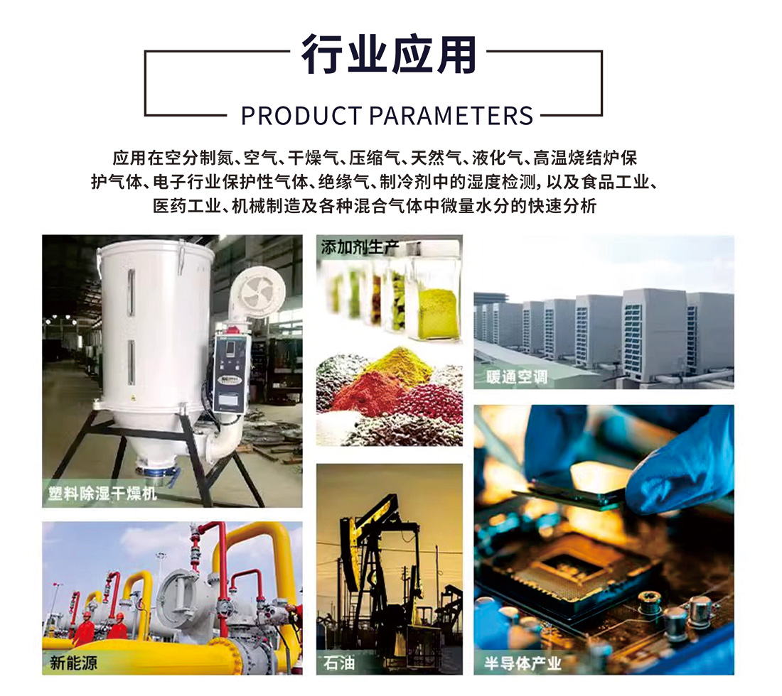 應(yīng)用 : 應(yīng)用在空分制氮、空氣、干燥氣、壓縮氣、天然氣、液 化氣、高溫?zé)Y(jié)爐保護(hù)氣體、電子行業(yè)保護(hù)性氣體、絕緣氣、制冷劑中的濕度檢測,以及食品工業(yè)、 醫(yī)藥工業(yè)、機(jī)械制造及各種混合氣體中微量水分的快速分析