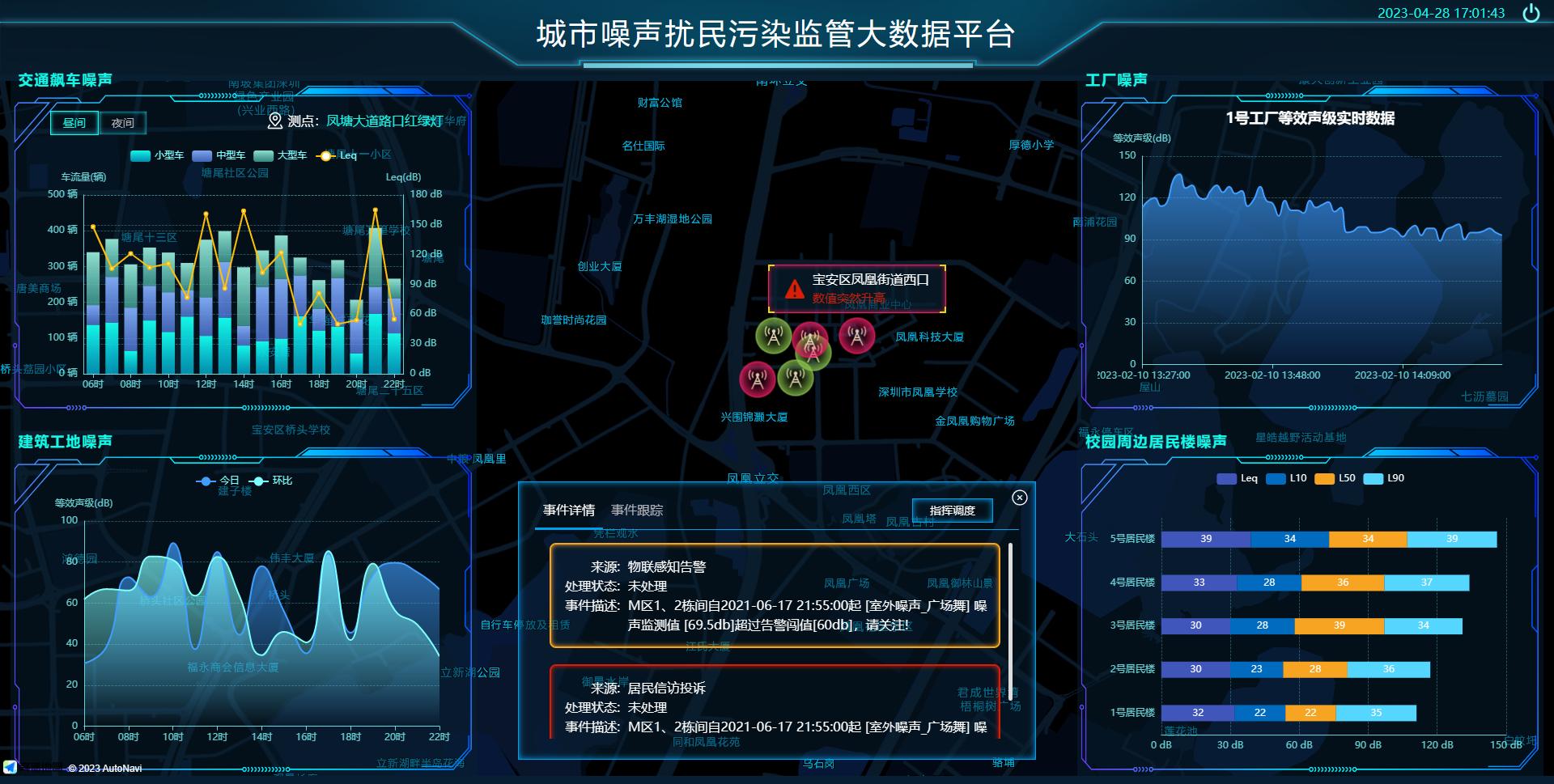 聲環境大屏,顯示所有前端設備的實時狀態、監測數據和噪聲污染擴散圖,便于管理部門更好地實施污染排放情況的全局監控、預警和協調調度,及時控制超標排放,避免環保污染擴大。通過平臺可以實時查看到噪聲監測點分布、進行噪聲問題定位,通過數據分析進行故障診斷、噪聲治理等工作。