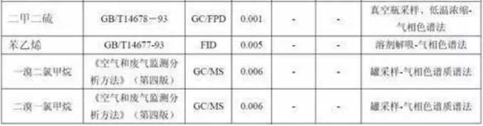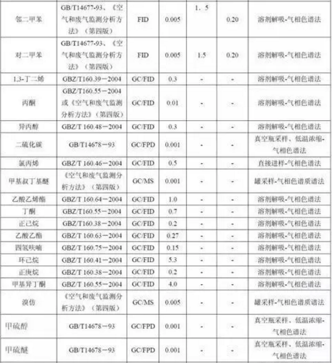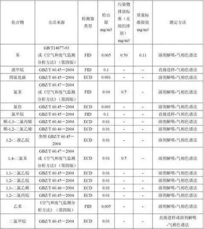 我國對環境空氣中揮發性有機物監測分析方法以吸附劑采樣,溶劑洗脫、氣相色譜分析為主,大都以單個組分分析,檢出限較高。國內相關監測分析方法見下表。