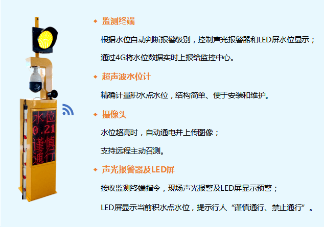 ◆ 集水位、視頻數(shù)據(jù)監(jiān)測(cè)、采集、上傳,LED屏提示、聲光報(bào)警等功能于一體