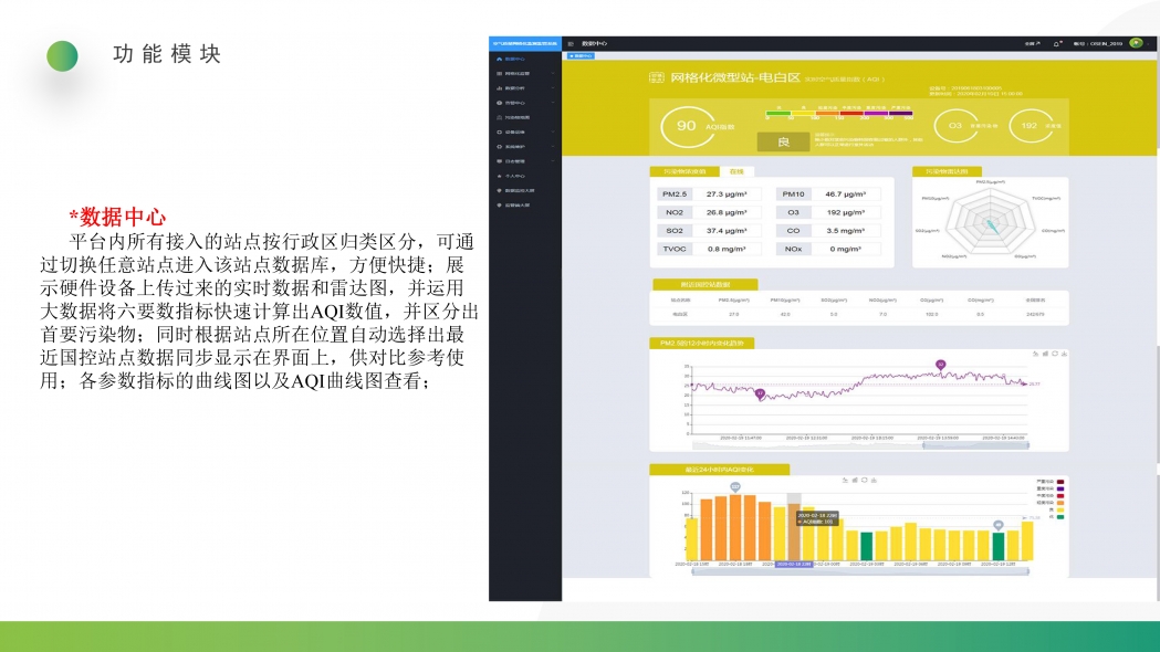 平臺內(nèi)所有接入的站點按行政區(qū)歸類區(qū)分,可通過切換任意站點進入該站點數(shù)據(jù)庫,方便快捷;展示硬件設備上傳過來的實時數(shù)據(jù)和雷達圖,并運用大數(shù)據(jù)將六要數(shù)指標快速計算出AQI數(shù)值,并區(qū)分出首要污染物;同時根據(jù)站點所在位置自動選擇出最近國控站點數(shù)據(jù)同步顯示在界面上,供對比參考使用;各參數(shù)指標的曲線圖以及AQI曲線圖查看;