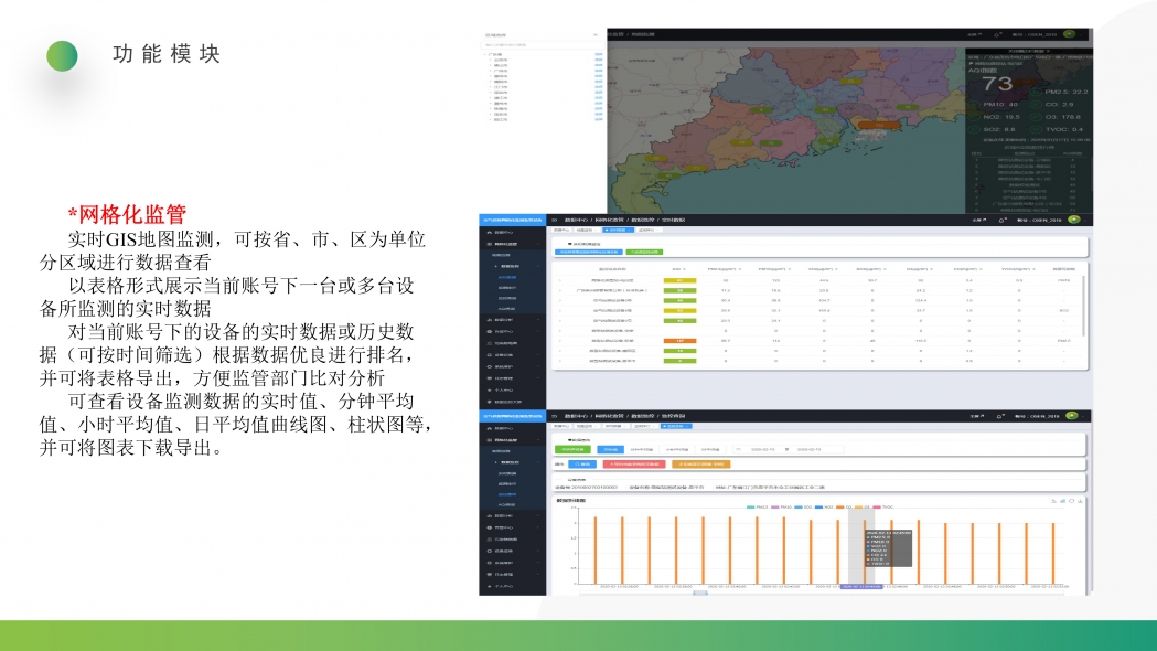 實時GIS地圖監(jiān)測,可按省、市、區(qū)為單位分區(qū)域進行數(shù)據(jù)查看以表格形式展示當前賬號下一臺或多臺設備所監(jiān)測的實時數(shù)據(jù)對當前賬號下的設備的實時數(shù)據(jù)或歷史數(shù)據(jù)(可按時間篩選)根據(jù)數(shù)據(jù)優(yōu)良進行排名,并可將表格導出,方便監(jiān)管部門比對分析可查看設備監(jiān)測數(shù)據(jù)的實時值、分鐘平均值、小時平均值、日平均值曲線圖、柱狀圖等,并可將圖表下載導出。