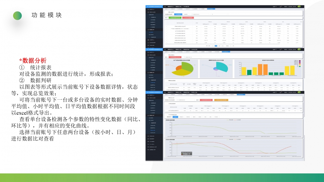 以圖表等形式展示當前賬號下設備數(shù)據(jù)詳情,狀態(tài)等,實現(xiàn)總覽效果;可將當前賬號下一臺或多臺設備的實時數(shù)據(jù)、分鐘平均值、小時平均值、日平均值數(shù)據(jù)根據(jù)不同時間段以excel格式導出。查看單臺設備檢測各個參數(shù)的特性變化數(shù)據(jù)(同比、環(huán)比等),并有相應的變化曲線。選擇當前賬號下任意兩臺設備(按小時、日、月)進行數(shù)據(jù)比對查看