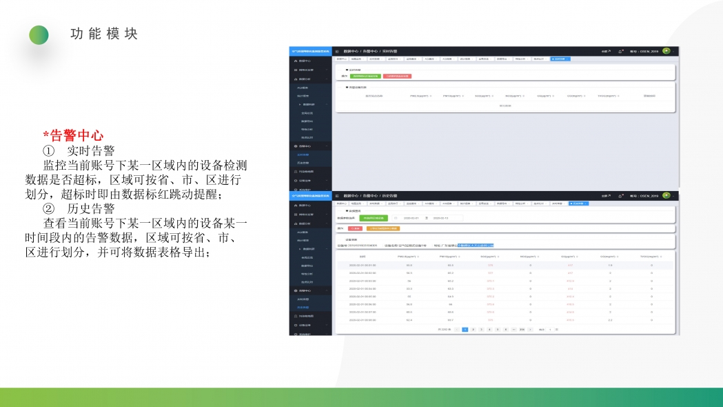 監(jiān)控當前賬號下某一區(qū)域內(nèi)的設備檢測數(shù)據(jù)是否超標,區(qū)域可按省、市、區(qū)進行劃分,超標時即由數(shù)據(jù)標紅跳動提醒;