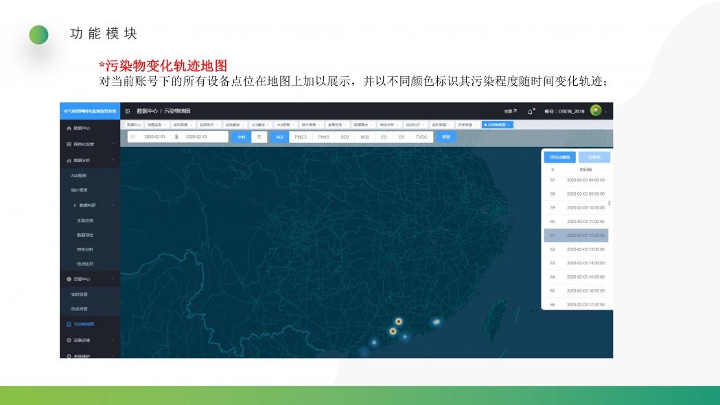 對當前賬號下的所有設備點位在地圖上加以展示,并以不同顏色標識其污染程度隨時間變化軌跡;