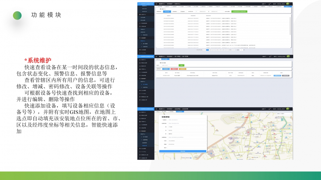 快速添加設備,填寫設備相應信息(設備號等),并附有實時GIS地圖,在地圖上選點即自動填充該安裝地點位所在的省、市、區(qū)以及經(jīng)緯度坐標等相關信息,智能快速添加