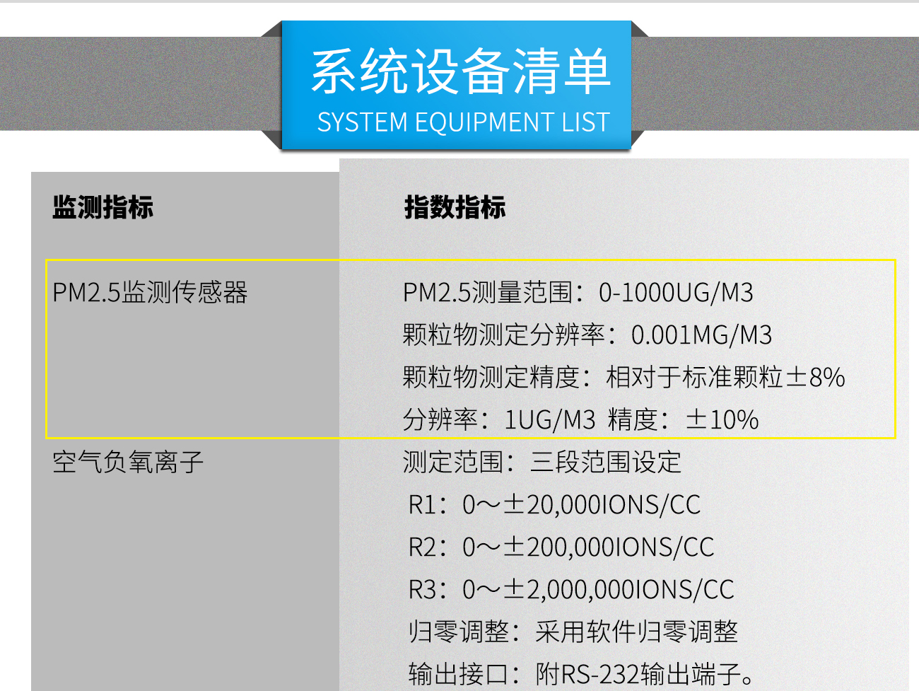 | 監(jiān)測指標 | 規(guī)格型號 | 指數(shù)指標 |