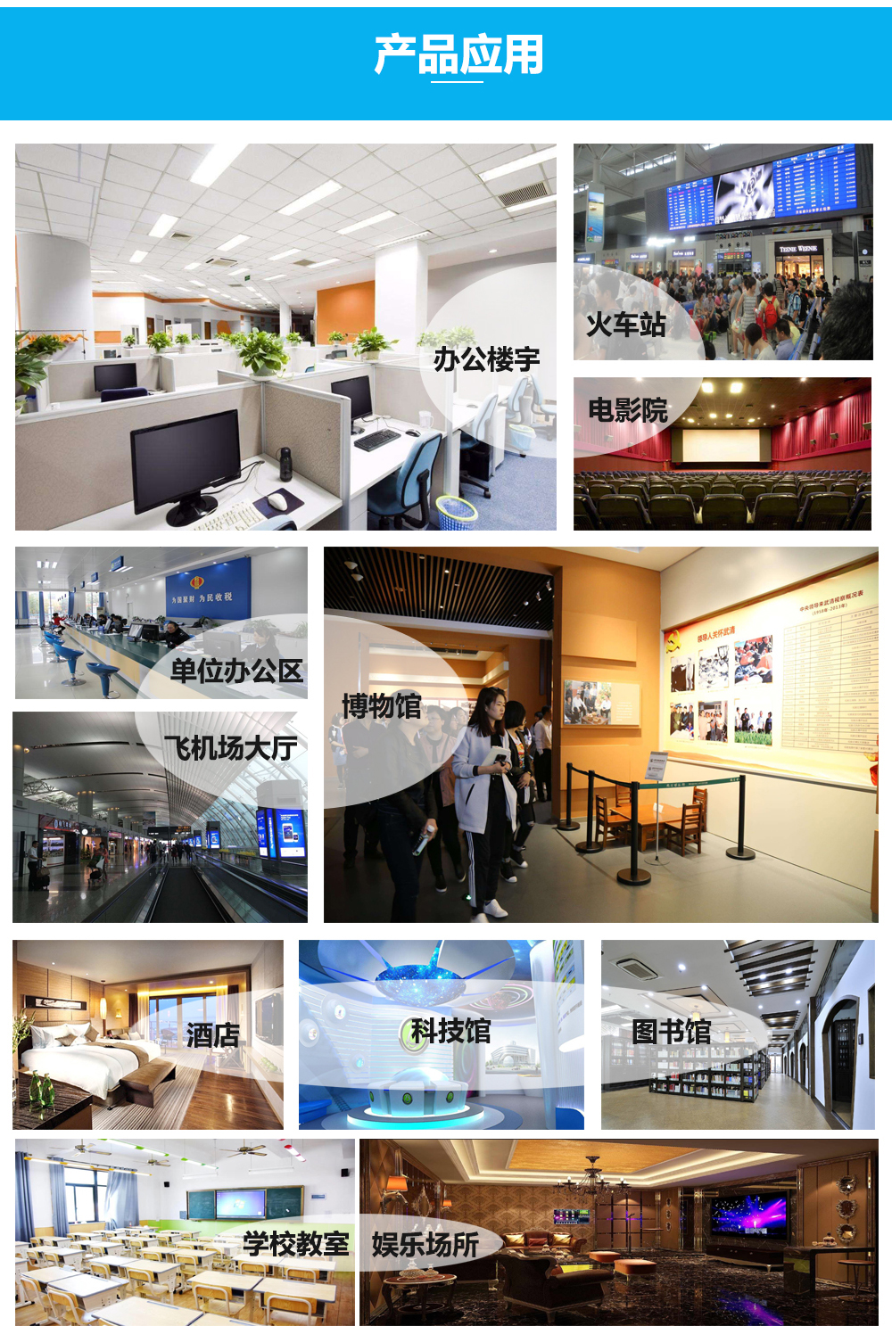 應用 : 可用于住宅、醫院病房、老年建筑、幼兒園、學校教室、辦公樓、旅店、文化娛樂場所、書店、圖書館、展覽館、體育館、商場(店)、公共交通工具等候室、醫院候診室、飯館、理發店等建筑