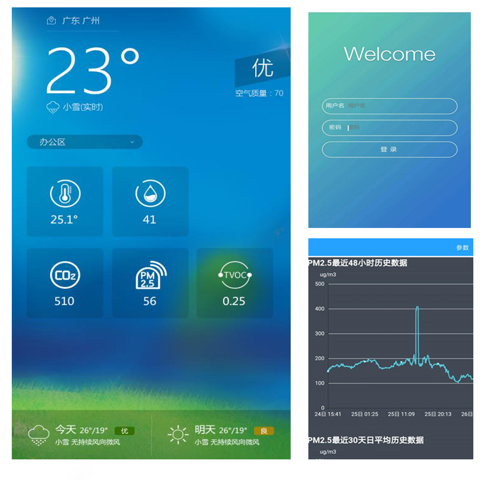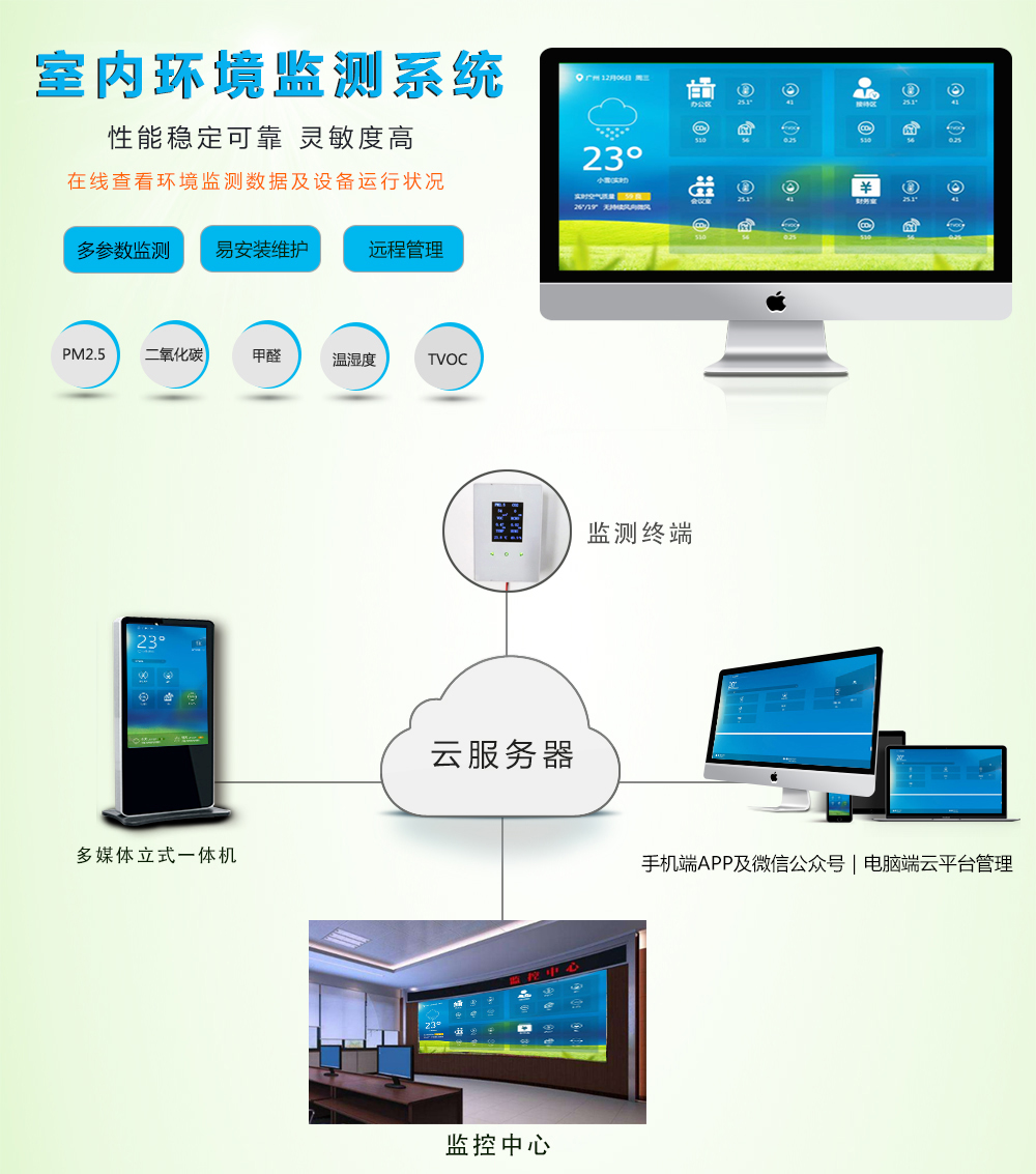 室內專用環境檢 監測系統終端是一款專門針對家居及公共場所室內環境而定制全面24小時實時在線監測的系統,可以在手機端、電腦端遠程查看相關監測數據。