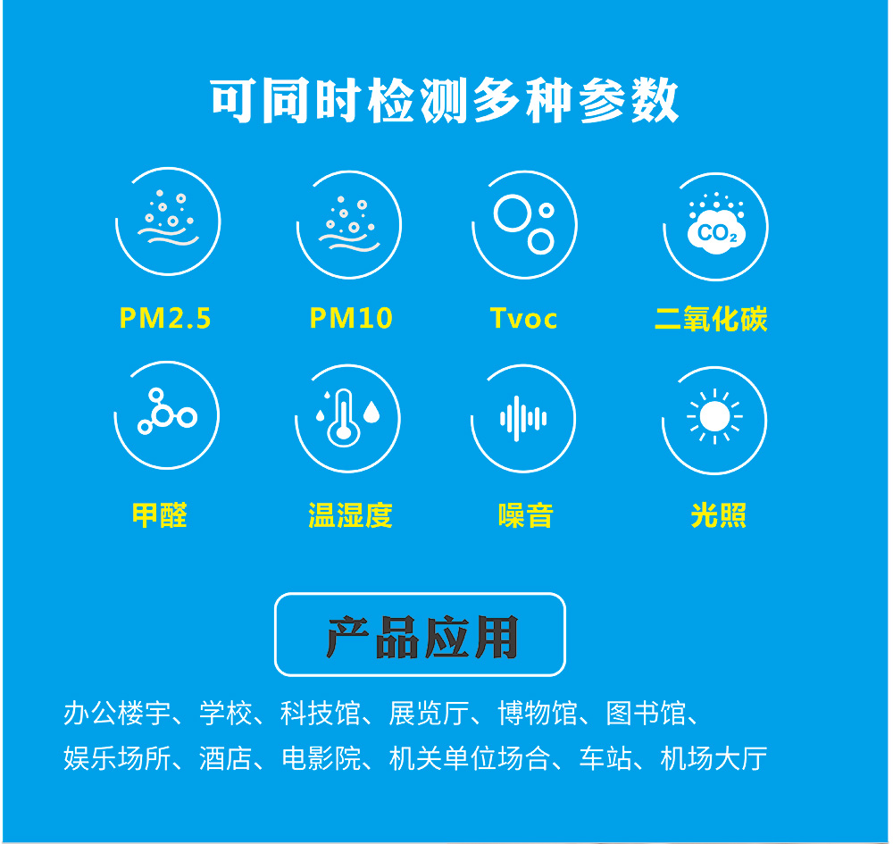 應用 : 辦公室、教室、酒店、車間、公共場所等環境監測