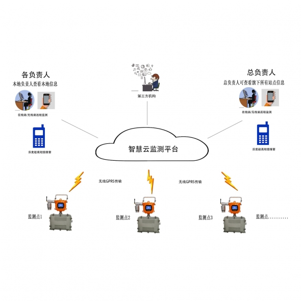監(jiān)測(cè)點(diǎn)1 23....通過(guò)GPRS傳輸?shù)皆破脚_(tái),管理者可以通過(guò)遠(yuǎn)程登錄平臺(tái)賬號(hào)進(jìn)行查看點(diǎn)位實(shí)時(shí)濃度檢測(cè),手機(jī)或者PC端都可查看;