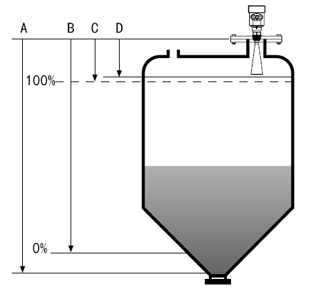 注:使用雷達物位計時,務必保證最高料位不能進入測量盲區(圖中D所示區域)。
