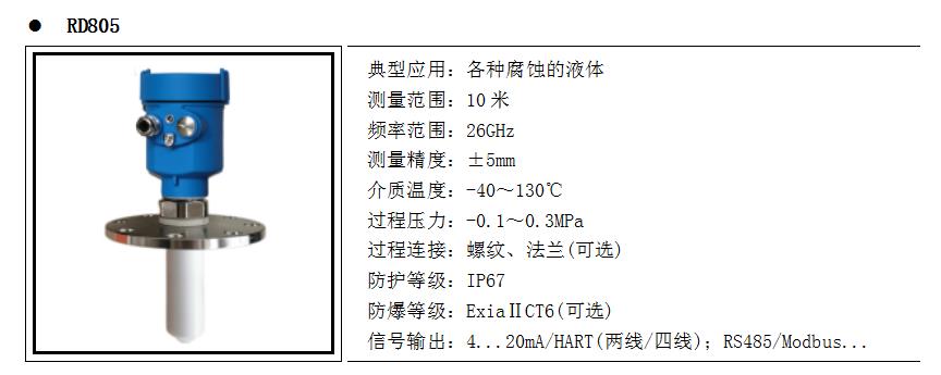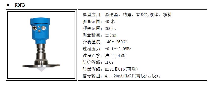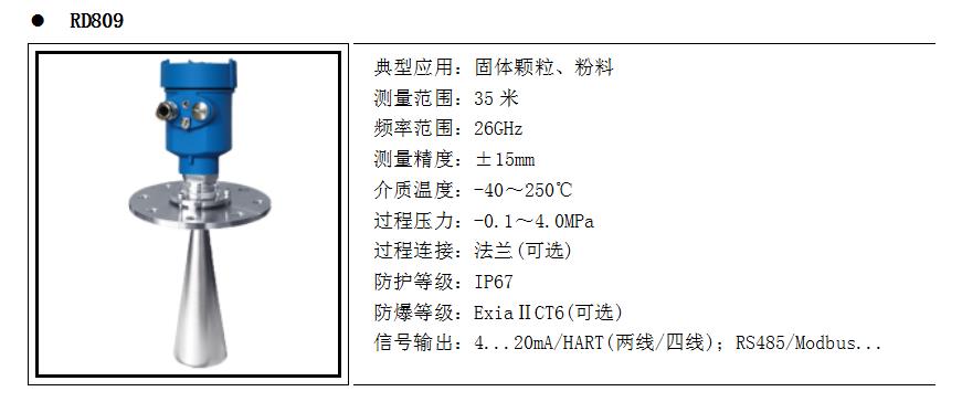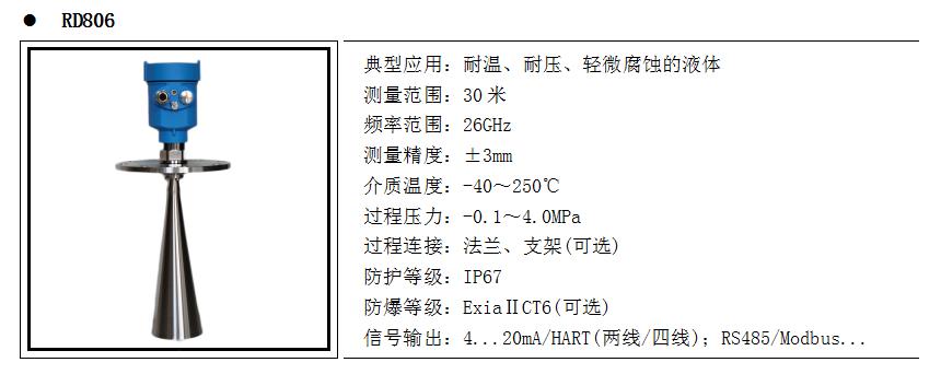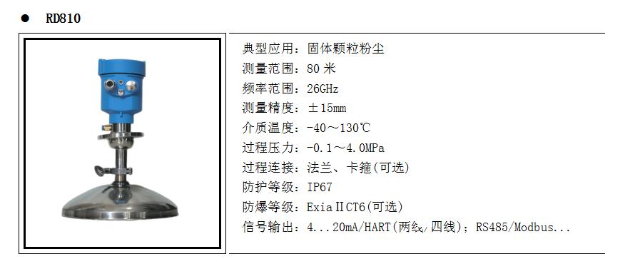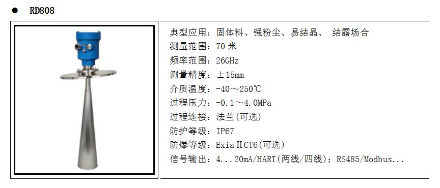產品概述RD80X系列傳感器是26G高頻雷達式物位測量儀表,測量最大距離可達80米。天線被進一步優化處理,新型快速的微處理器可以進行更高速率