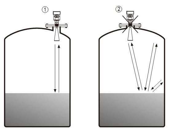 Ø 儀表不能安裝在拱形或圓形罐頂中間。除了會產生間接回波還會受到多次回波的影響。多次回波可能比真正回波的信號閥值還大,因為通過頂部可集中多個回波。所以不能安裝在中心位置。