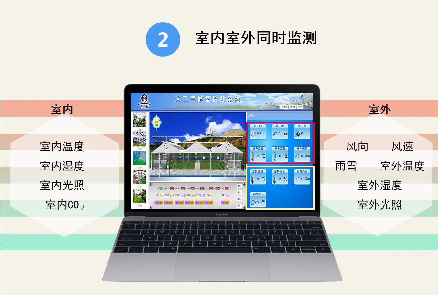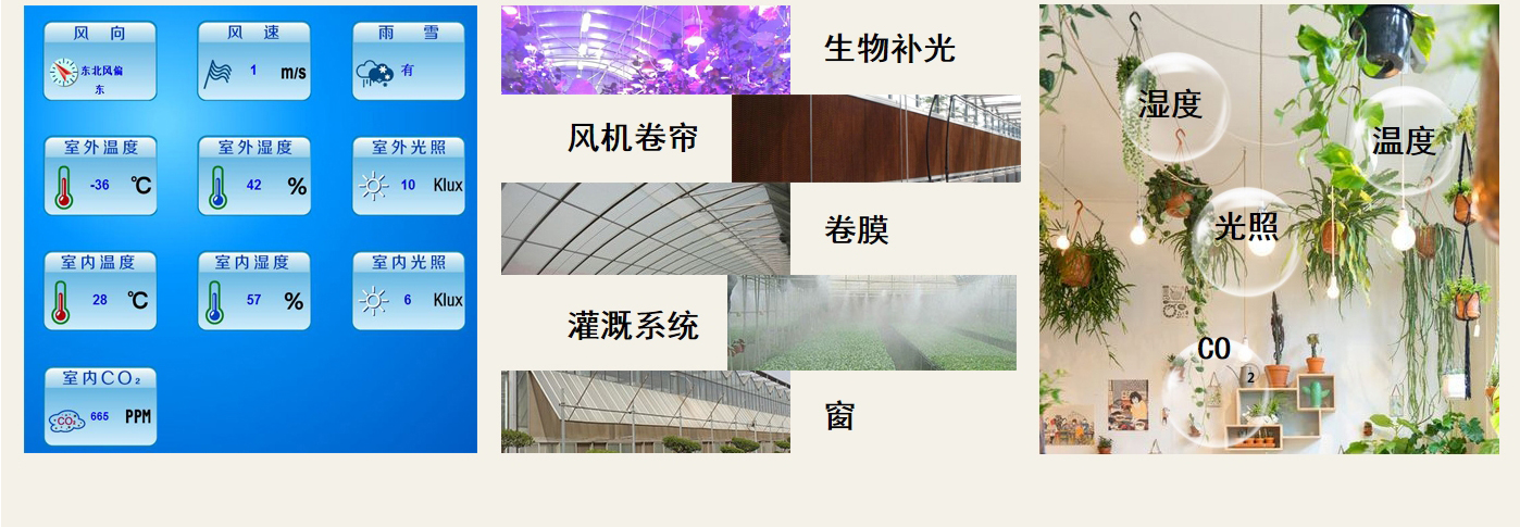 主要監控室內空氣溫濕度、二氧化碳、光照強度、土壤溫濕度,室外風向、風速、空氣溫濕、光照強度、雨雪等參數,各個設備的運作狀態,當室內出現異常時會進行報警上報負責人。 |