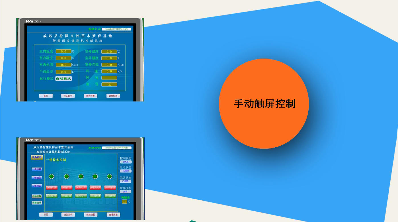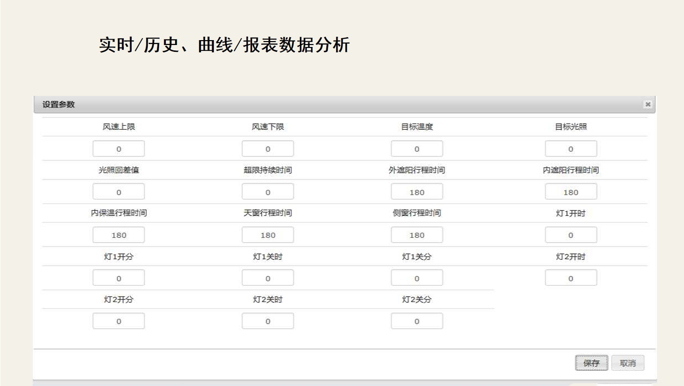 對所有要實現自動控制的參數(風速、光照、土溫、土濕、空氣溫濕、內遮陽、內保溫、燈光、補光、目標溫度、目標光照、噴灌)進行設定,滿足自動化要求。 |